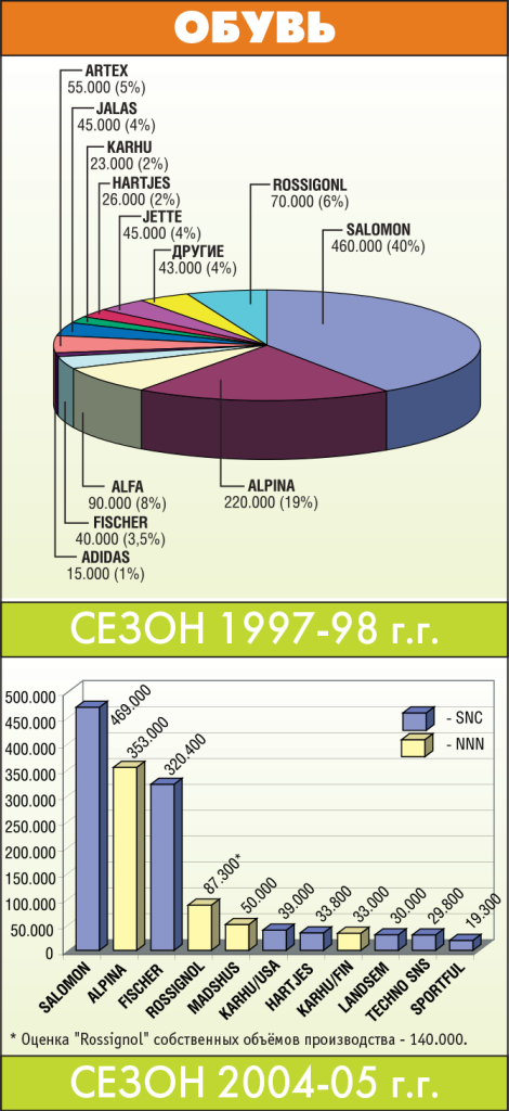 2. Из этого количества порядка 450-500.000 — российского производства (в том числе выпущенного под иностранными марками), 100-150.000 — импортного, в том числе украинской «TISA», чешского «Nordway» (выпущенного на Sportland), «Карелия» — 110.000 пар без экспорта, STC на Россию (без экспорта) — 300-350.000 пар, остальные фабрики — 40-90.000 пар.