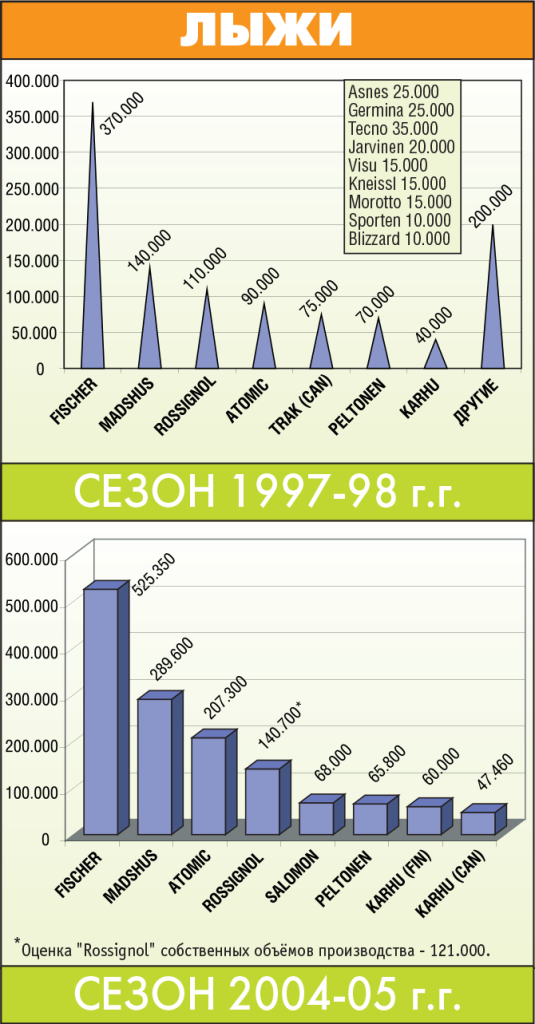 "Salomon" на удивление стабилен, "Alpina" прибавила очень сильно — более чем в полтора раза, но главная сенсация, кроется, конечно, в столбике под №3 — "Fischer". Посмотрите на диаграмму восьмилетней давности — вы с трудом сможете обнаружить там небольшой голубой сегмент с цифрой 40.000. Согласитесь, рывок за каких-нибудь 8 лет совершён более чем внушительный.