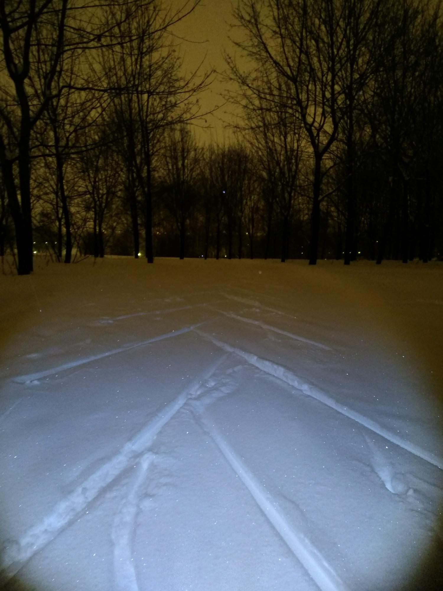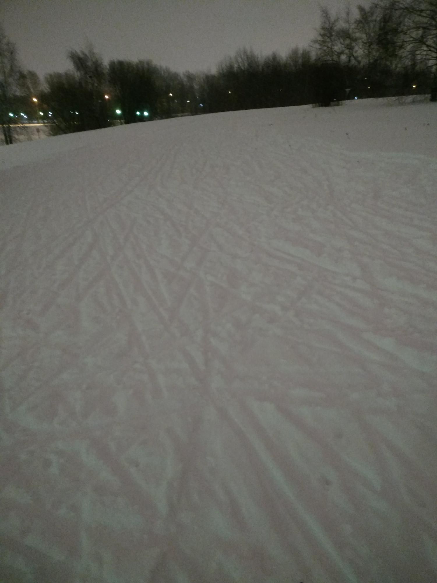 Ратрака не было уже неделю, но трасса в хорошем состоянии. Достаточно плотно и ровно. Горба нет, особых ям тоже. Разве что местами чуть затоптали собачники. Пока катался подсыпало 2-3см, обновило полотно трассы. Так что катаемся, сезон продолжается, что не может не радовать.