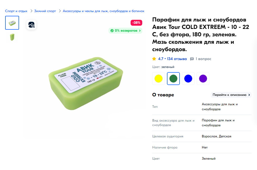 Приобрел парафин этого бренда. Брал базовый для очистки лыж и консервации. В принципе парафин, как парафин. Плавится легко ничем особо не воняет. Из минусов - очень мягкий. Сложно снимать, т.к. прилипает и размазывается)