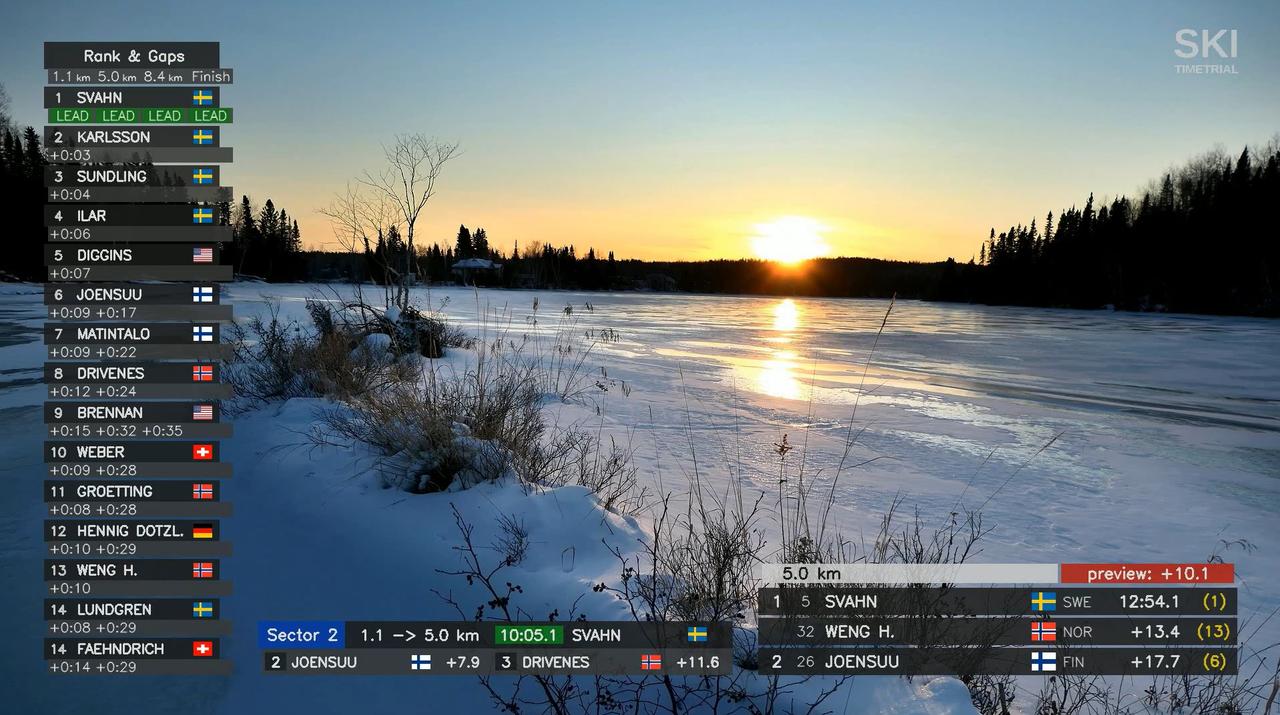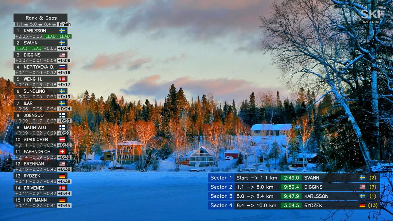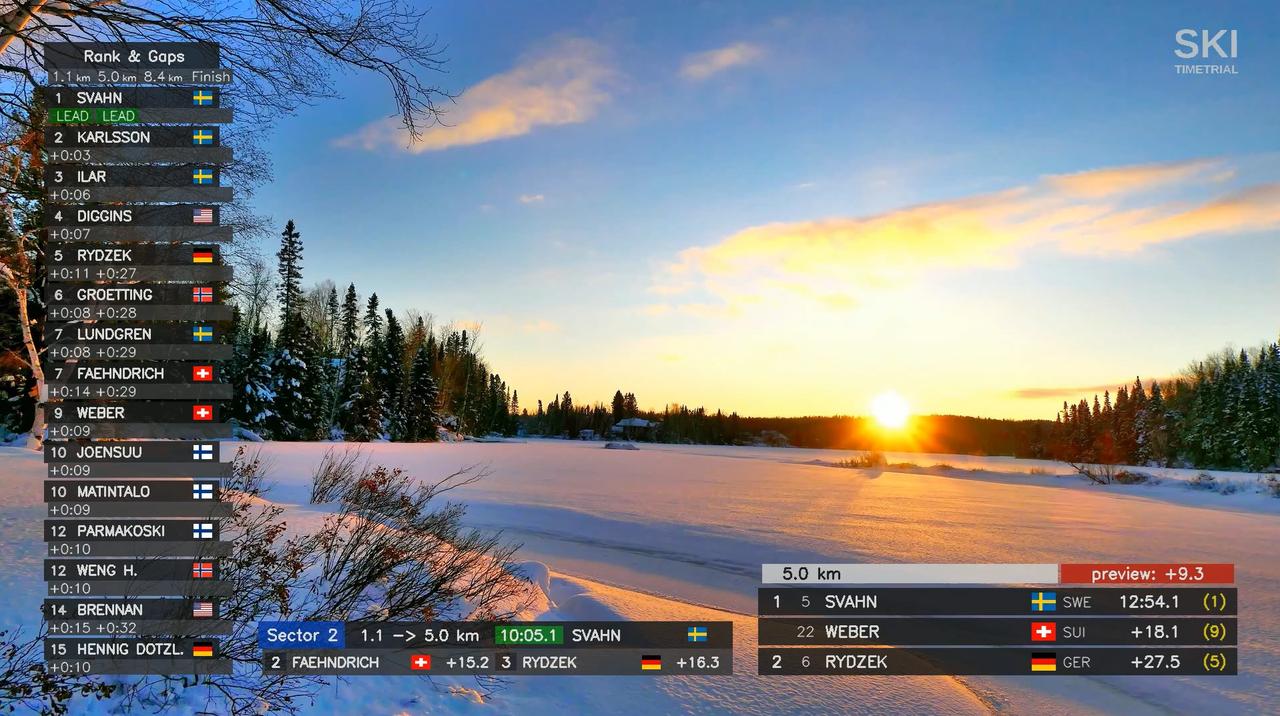 Данные беру из лайв-тайминга, в данном случае с сайта FIS, по ним моделирую гонку. Поступление данных о пересечении спортсменами отсечки имитируется внутри программы. То есть видео (и картинки из него) сформированы по реальным данным гонки (женская разделка с Кубка мира в Лахти), но с настоящими системами хронометража в режиме реального времени я не работал.