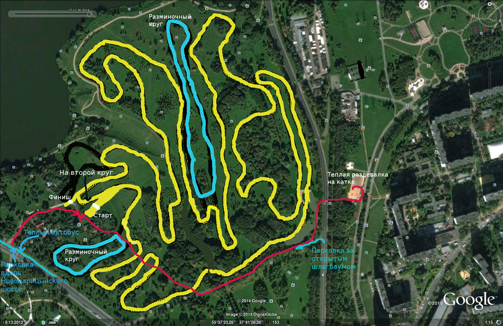 Сегодня в первый раз прокатился по трассе. Ехал просто по проратраченной трассе и хватанул все разминочные круги. Итого, где-то 6500 м. Я не знал куда надо сворачивать, что бы идти именно на пятёрку. А завтра хотя-бы в местах выезда на разминочные круги (примерно на 1 и 3 км.) трасса в 5 км. будет как-то обозначена (как-бы не уехать не туда)?