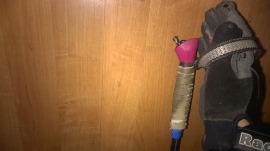сверху из пластыря, над указательным и большим пальцем валик. Тогда палка в руках остается, если увязнет. И при возврате палки ее можно слегка удерживать 2 мя пальцами, без напряга.