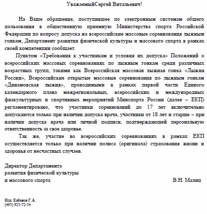 пару недель, после темы по справкам, назад отправил следующие "дилетантское" письмо в министерство спорта: