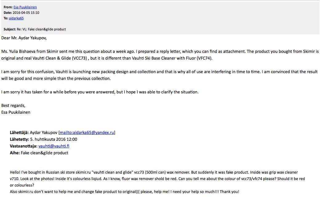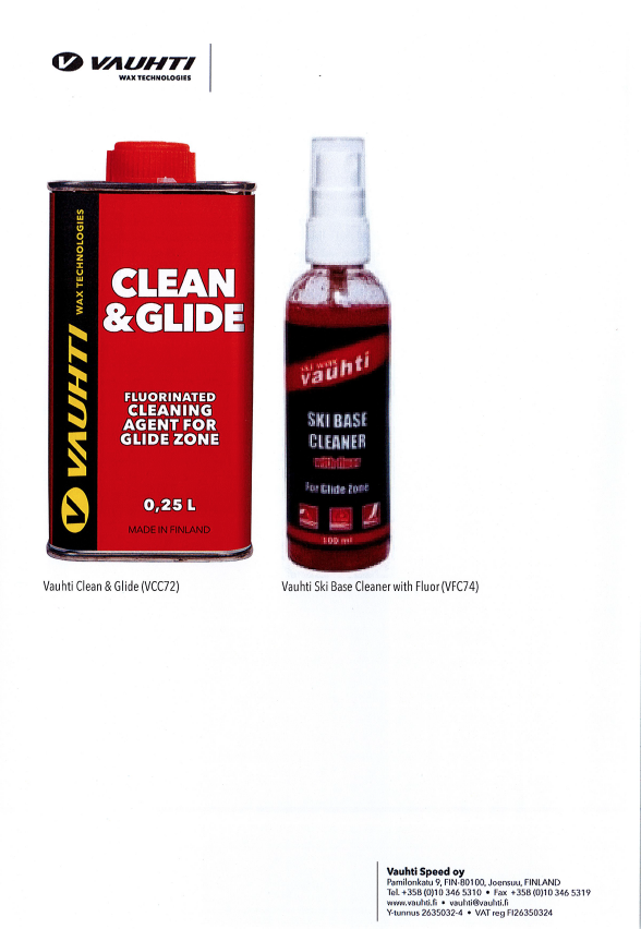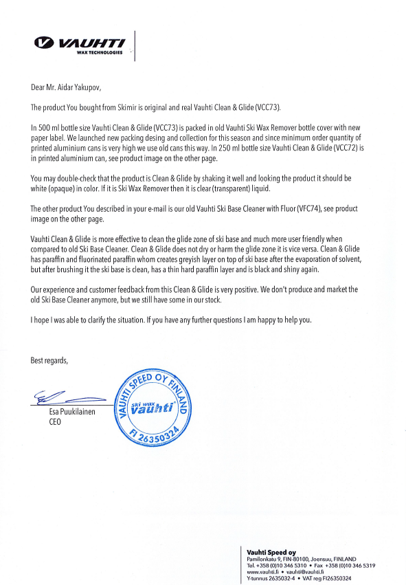 Товар, который Вы приобрели у компании Skimir - это настоящий растворитель Vauhti Clean & Glide (VCC73). Жидкость объемом 500 мл. - Vauhti Clean & Glide (VCC73) была налита в старый бутылек из под смывки Vauhti Ski Wax Remover, обклеенный новой этикеткой. Мы запустили новый упаковочный дизайн и новые товары в этом сезоне. И в связи с тем, что минимальный объем заказа на бутыльки с напечатанным нанесением очень велик, мы были вынуждены использовать старые бутыльки. Бутылек размером 250 мл с Vauhti Clean & Glide (VCC73) в свою очередь предложен в алюминиевой банке с печатью, нанесенной на саму банку, пожалуйста, посмотрите картинку на следующей странице. Вы можете перепроверить тот факт, что приобретенный товар действительно является растворителем Clean & Glide, хорошенько встряхнув его и посмотрев. Продукт должен быть белого (матового) цвета. Если же это Ski Wax Remover, то жидкость останется прозрачной. Другой товар, который вы описываете в своем письме, это старый растворитель Vauhti Ski Base Cleaner с фтором (VFC74), посмотрите изображение этого товара на следующей странице. Vauhti Clean & Glide более эффективен для очистки скользящей поверхности лыж и намного более бережлив по сравнению со старым растворителем Ski Base Cleaner. Clean & Glide не сушит лыжи и не вредит скользящей поверхности. Clean & Glide содержит фторовый парафин, который создает особый слой сероватого цвета на поверхности лыж после испарения растворителя, но если использовать щетку, то поверхность лыж очищается, остается тонкий слой парафина, и поверхность лыжи снова приобретает блеск. По нашему опыту, отзывы клиентов о растворителе Clean & Glide очень позитивные. Мы больше не производим и не продвигаем старый растворитель, хотя все еще небольшое количество есть у нас на складе. Надеемся, что нам удалось прояснить эту ситуацию. Если у вас возникнут дальнейшие вопросы, буду рад вам помочь.
