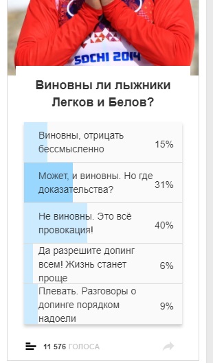 когда наших ловят и отстраняют, так как это было с нашими чемпионами Даниловой, Лазутиной, Чепаловой, Деменьтевым и тд. Толпы болельщиков не верят в это кричат, что не справедливо что у них чемпионская кровь и они чисты, но сейчас уже из тех кто так говорил все поверили что они бегали на ЭПО и забыли про это, а не один из наших пойманных спортсменов не признался до сих пор, что бегал на ЭПО, как это сделали Микка Мюллула, Амстронг, Инсометса и другие, и конечно же надо быть совсем наивным чтобы думать что на ЭПО они стали бегать когда их поймали, а до этого они выигрывали золото олимпиады чистыми (это совсем смешно и глупо так предполагать), так и сейчас наши будут идти в отказ до конца, но через 4-5 лет все всплывет. Пусть уж кого ловят и отстраняют пожизненно будут мужиками и скажут, что да я нарушил правила (но они будут бояться так признаться, ведь тогда окажешься врагом народа и государства, ничем не лучше Родчинкова) Надо относится к этому как должное, многие говорят да их жалко они вкалывали как лошади, а тут такое, они 10 лет получали з/п и призовые, кормились за счет страны, не повезло попались именно они. А почему вам не жалко тех, кого еще на ЧР отстранили за допинг, когда они выграли его (например случай с Лилией Степановой, которая откосила ЧР и тем же нашим призерам олимпиады привезла кучу минут), она что меньше вкалывала чем Саша Легков??? пропусти ее РУСАДА она бы туже Бьерген Разорвала бы на олимпиаде, но нет она не из этой компании приближенных оказалась и таких случаев сотни, а вкалывают они за свои деньги и не меньше наших чемпионов в условиях хуже... Поэтому относится надо как должное попался, все на тебя свалили, признайся, чтобы наивному народу головы не глумить (сами выбирали эту игру) спокойно уйди, как Ярошенко в биатлоне и занимайся другим делом...