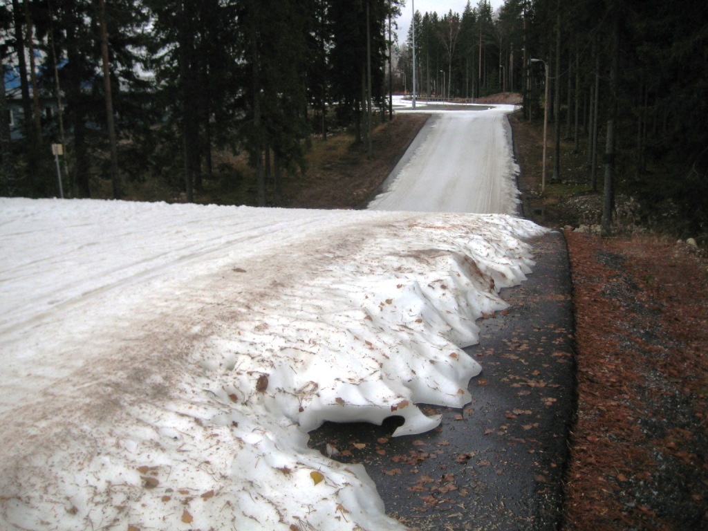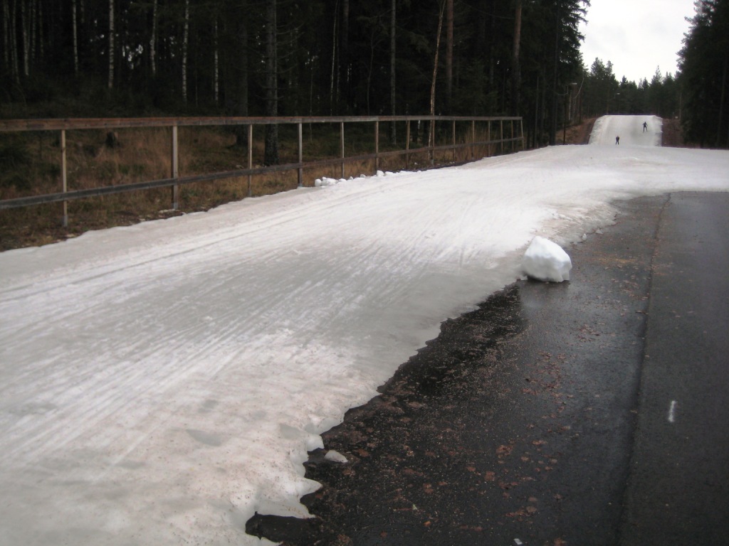 Что ж, будем кататься по 1,5-километровому кругу, благо он в точности повторяет тот круг, по которому мы катались и в прошлом, и в позапрошлом году. И, честно говоря, кататься по нему было больно. Было видно, что снег тает, то тут, то там на трассе стали попадаться пятна асфальта и было понятно, что и эти пятна даже на таком маленьком 1,5-километровом круге закрыть финнам нечем: на улице - устойчивый плюс, снега в запасе нет, и трасса, по-видимому, доживала свои самые последние дни.