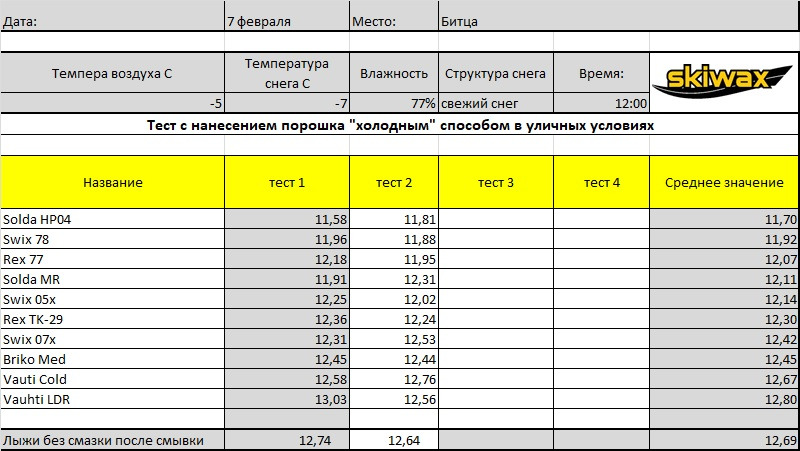 1. Непосредственно это тестирование проводилось без контрольной откатки после нанесения под утюг. Так как гонка завтра 10км и износостойкость смазки практически не имеет значения - любой вариант отработает такую дистанцию. Для марафонов два лучших варианта кладутся под утюг на лыжи и откатываются. После этого принимается решение. 2. между 1-й и 2- попыткой происходит возвращение лыжника на начальную точку.