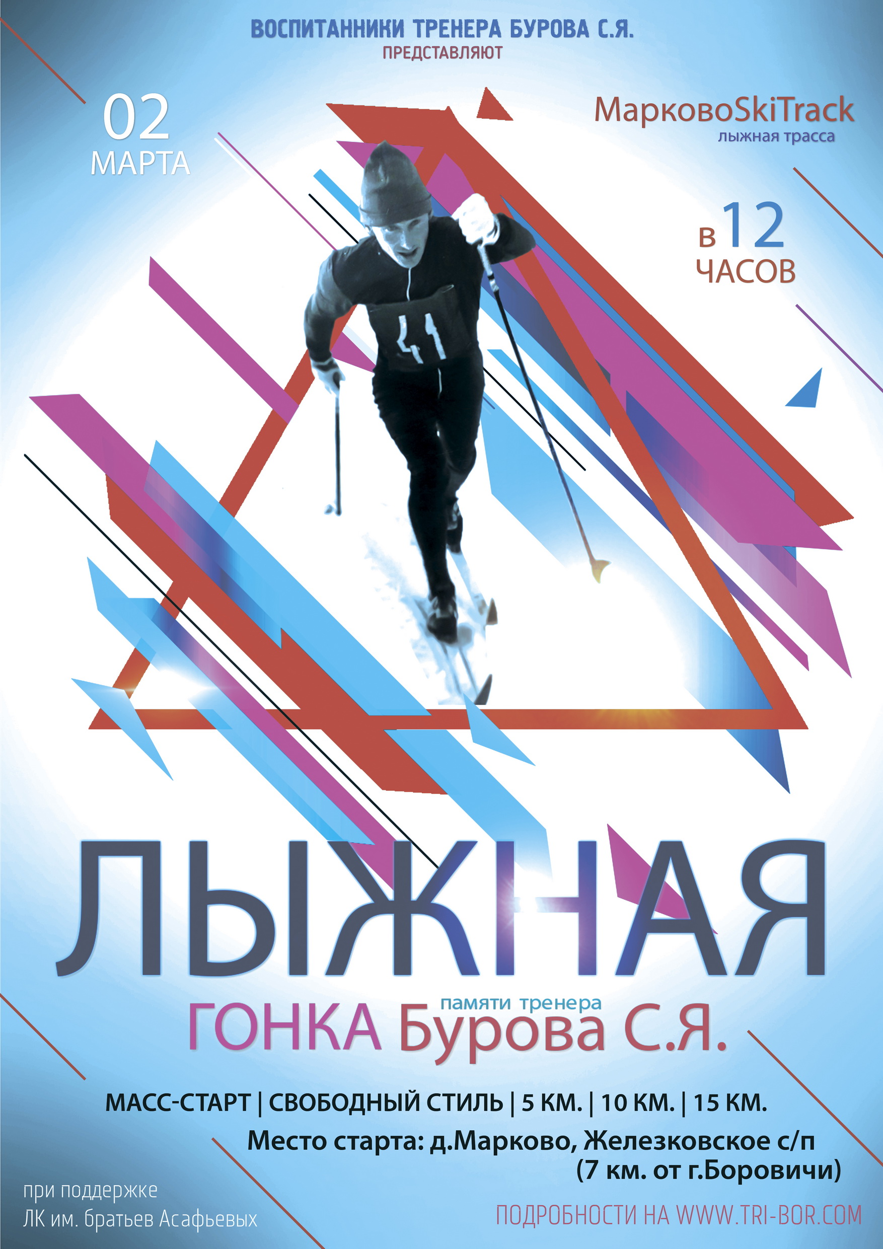 В настоящий момент мы уже готовы принять соревнования хорошего уровня. И посвящаем мы их, конечно, нашему Тренеру - Бурову Сергею Яковлевичу. Наш коллектив, совместно с родственниками Сергея Яковлевича Буровым Виталием и Морозовым Сергеем приглашает Вас на наш старт! Так же благодарим Валдайский лыжный клуб братьев Асафьевых за предоставление системы тайминга с чипами для участников гонки.