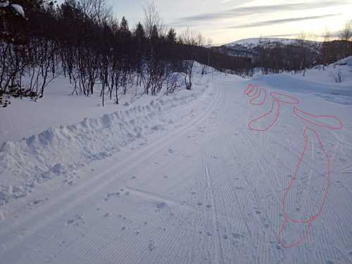 На следах от гусеницы 380 мм тесновато, а если гусеница 500 мм и оставляет канавки , то две внутренние - это почти лыжня, да и места хватает. Проблема не в толчках и комфорте. Если мотособака с передним лыжным модулем сползла с крутого лесистого склона, ехать по её извилистым следам жутко опасно. Если не вписался в поворот, убьёшься о дерево. А в контруклон за ней не влезть ни лесенкой, ни ёлочкой, ибо не хватает места для лыж, и их приходится снимать. А вот на ЛЭП, нефте - и газопроводах вполне нормально можно ездить. Особенно по нефтепроводу "Кириши - Приморск", потому что туда не пускают квадроциклистов.