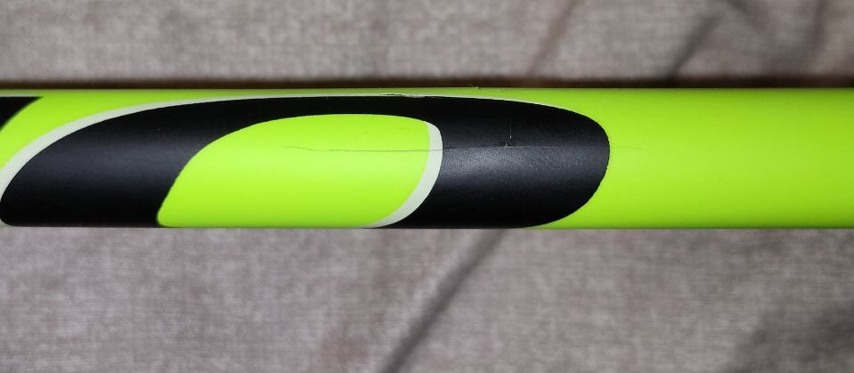 Расчехлил инвентарь и обнаружил трещины. Если прикладывать силу, как при отталкивании, не ощущается что жесткость нарушена. Когда давлю пальцами в месте трещин, есть ощущение что проблема будет усугубляться, слышен характерный треск волокна. Скорее всего разваляться, если ударяться об лыжи или будет еще какое-либо боковое воздействие.