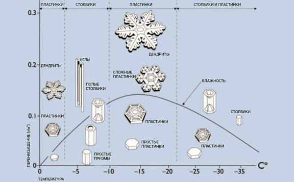 Профессор Укихиро Накайя из университета в Хоккайдо первым предположил, что величина и форма снежинок зависят от температуры и влажности воздуха, и подтвердил эту гипотезу экспериментально, выращивая в лаборатории кристаллы льда разной формы. С понижением температуры обычно снежинки становятся более мелкими. Меняется и форма снежинок: от красивых правильных звездочек - к пластинкам и неправильным столбикам.