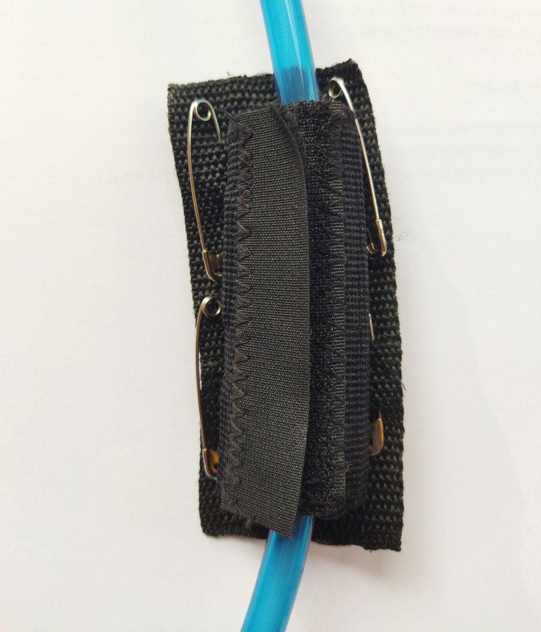На кусок широкой капроновой ленты нашил скрутку из липучки, куда внутрь прячется-укладывается трубка. Лента крепится на стартовый номер булавками в любое место - как правило чуть слева вверху.