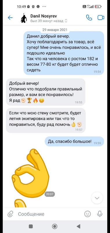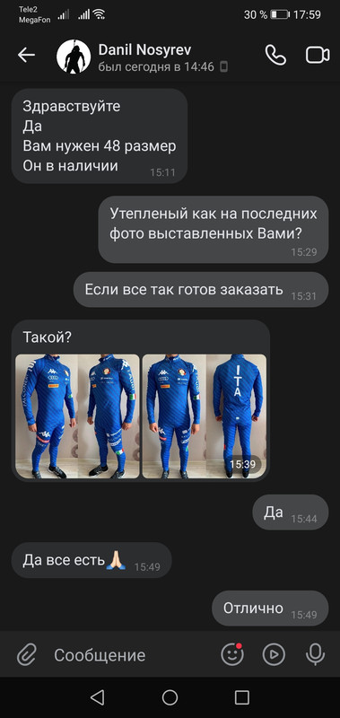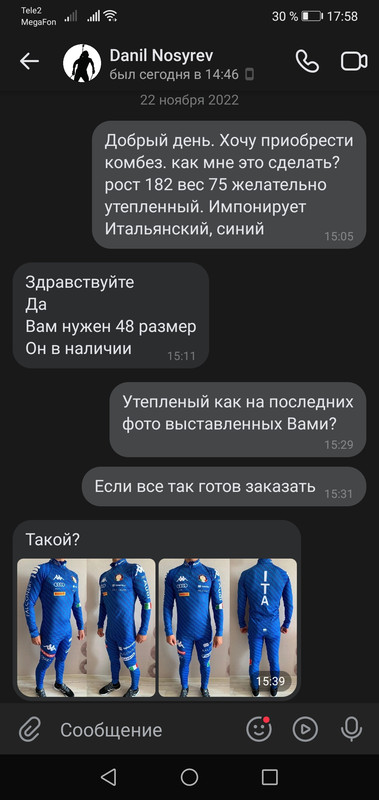 Знакомство Состоялось 22 ноября. На фото видно, что дал свои данные и продавец сказал какой мне нужен размер. Сам я ничего не выбирал. При выборе комбеза мне приглянулся именно этот вариант подходящий к ботинкам. На фото представленным Даниилом было одно а по факту пришло совсем другое. С этого момента и началось недопонимание между нами. Обман с самого начало это не красит человека. Сюда я написал до появления его в общении со мной и так получилось, что я дал ложную информацию об продавце. Но если посмотреть на даты, то картина вся чётко вырисовывается. Вы тут нападаете на меня а я до сих пор не увидел опровержение продавца про его два дня а по факту неделя прошла, и вышел он на связь после связи с ним других людей. Спасибо им за это.