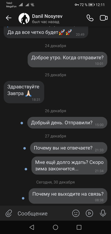 Неприятно конечно такое перед новым годом. На тренировку без настроения. Желаю в новом году чтоб такого небыло. Чтоб было взаимопонимание и договорённости на берегу. У каждого своя правда и тяжело встать на чью то сторону не зная всей информации. Идеальным было бы запостить все страницы переписки месячной истории без вырезания слов, дней и фото. Тогда станет все понятно. Если вы ведёте бизнес, то ненадо отварачиваться от своих покупателей. Объясняйте как есть и скрывать не стоит ничего так как все всплывёт на ружу со временем. Кормить завтраками и пропадать на неопределённое время. Я согласен бывает форсмажор так напиши, не заставляй переживать и ерзать на стуле