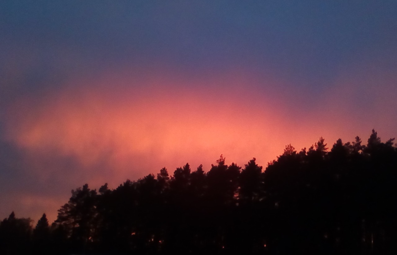 По сухой чистейшей трассе, с довольно вежливыми гуляющими. Их было много. И роллеристов - тоже. Правда, многие катали туда-сюда, от стадиона до канавки поперек асфальта перед нырком - и обратно. Но были и те, кто по всему кругу катал, как я. Потом побегал немного - а потом пошел сильный дождь. Он ждал, чтобы я закончил треню . После дождя был бонус - супер-закат. Оранжевые, сиреневые, красные тучи над лесом. Красиво. Парковка до дождя была забита. Много бегающих в лесу. Тренажеры замотаны скотчем, площадка с ними обтянута лентой. В лесу отсыпаны мелкими опилками дорожки для бега, очень удобно.