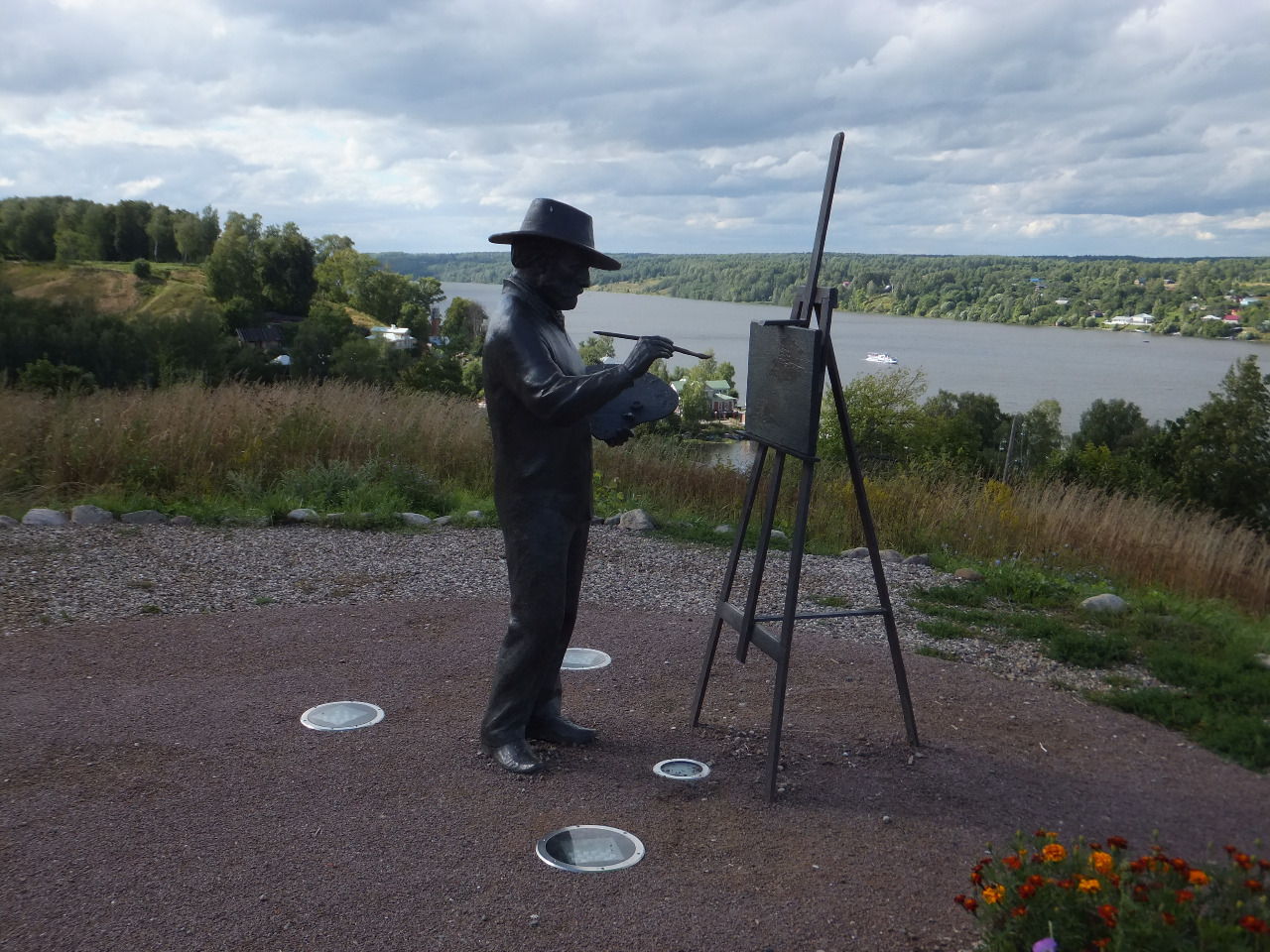 А на горе Левитана, рядом с церковью, стоит ...кто бы вы думали? Ясный пень, сам Левитан (правда, бронзовый). Рисует чего-то (Волгу, наверное - на нее же смотрит с высоты! А вот нет бы авторам чуть подумать - и развернуть его на 180. Исаак Ильич тогда спокойно мог зафиксировать на холсте нашу гонку - Волгу-то он уже увековечил, а нас - пока нет):