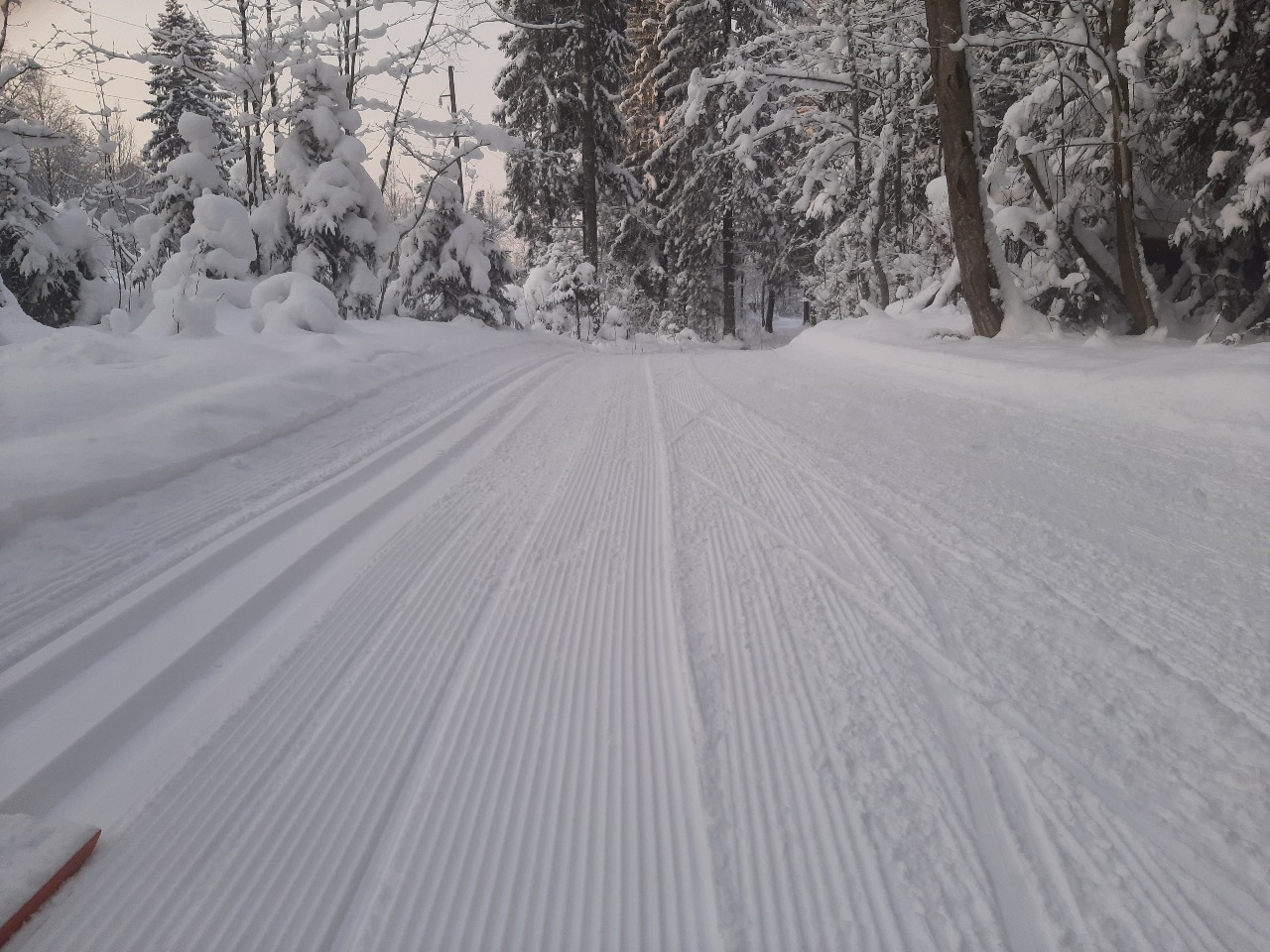 Температура -20 Трасса прокатана и готова на твердую 5ку, нарезана классика. Достаточно мягко, в лыжне иногда проваливается внешняя палка. На некоторых участках снег вообще не едет, даже в лыжне, как будто белая наждачка. Какие муки испытывают конькисты - даже не представляю.