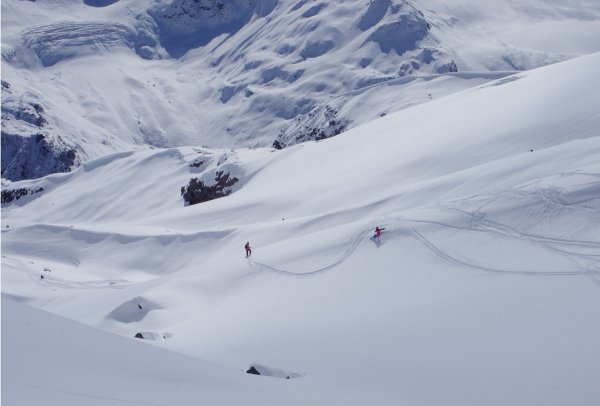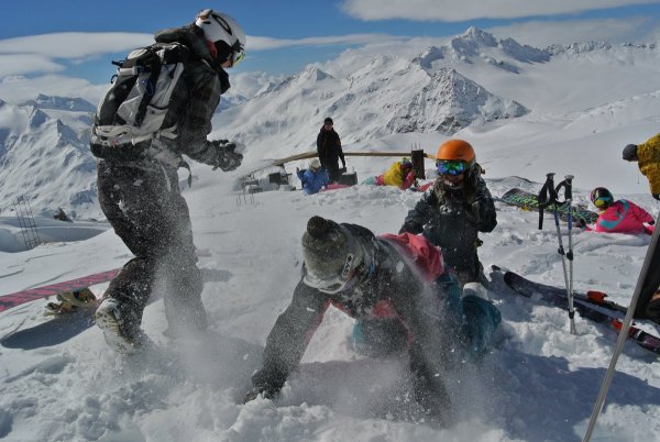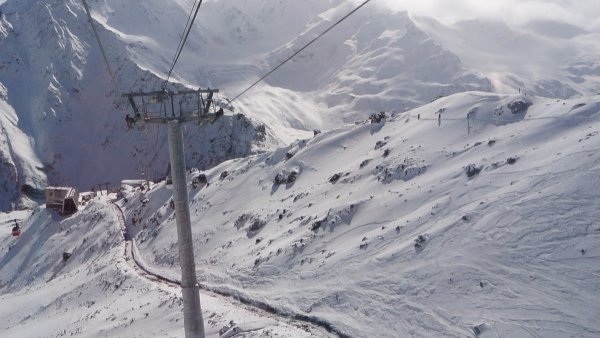6 октября выдался ясным и удался на славу. Снег плотный и в очень больших количествах. Очень обрадовало то, что хоть и свежий, а камней не видно нигде. Поднялись на высоту 3000 метров и поразились той картине, которая открылась нашему взору. Снег лежал пушистым одеялом на склонах Эльбруса. Спустились мы целых 5 раз, при этом даже ни разу не повторили уже пройденный маршрут на спуске. Скользяки лыж и досок остались целыми, а ведь мы умудрились даже немного попрыгать.