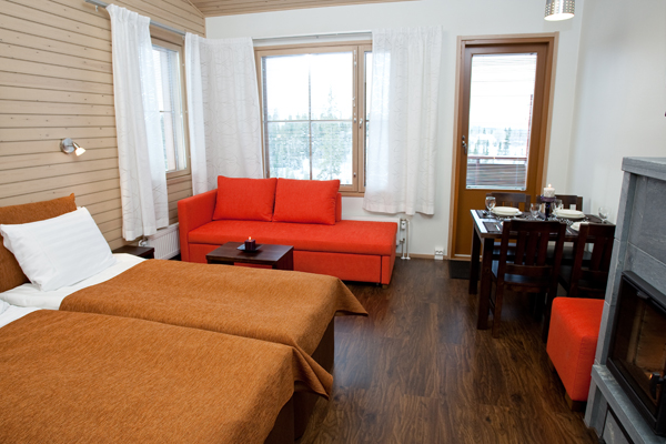 Апартаменты Aurinkorinne55 спланированы для семей или компаний. В апартаменте (55 кв.м) имеется 2 отдельные спальни (2 кровати по 80 см шириной каждая), гостиная с камином, кухня, туалет, сауна и балкон. Всего спальных мест 4+2 (диван в гостиной раздвигается на двуспальную кровать). Комфортная загрузка — 4 человека. Цена за апартамент (7 ночей) – 648 евро, на четверых по 162 евро/неделя.