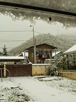 Снегопад начавшийся 29 октября на вершинах и хребтах Красной Поляны достиг уровня поселка и образовал устойчивый снежный покров до 10 см. Вид на улицу Турчинского в Красной Поляне