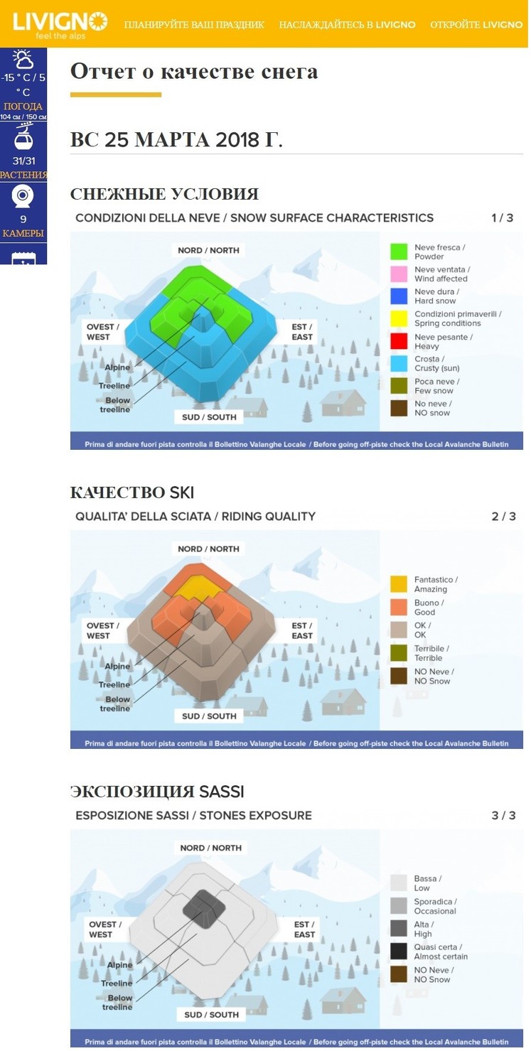 В наше присутствие в Ливиньо снег был довольно сложный. В прихребтовых районах была не глубокая целина до 20 см с ровной подложкой. Срединные части спусков – в зависимости от экспозиции варьировались от той же не глубокой целины (отпущенной, слегка влажной) и редко жестких участков. Ближе к выкату начиналась корка, причем временами достаточно злобная. Я не скажу, что это типично для этого региона. Эти типичное состояние снега для весны, когда днем температура плюсовая + солнечная инсоляция, а ночью минус.