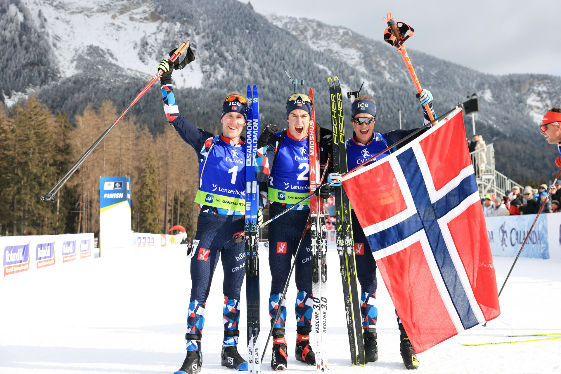 В мужской гонке весь пьедестал норвежский: Вебьорн Сорум выиграл с двумя кругами штрафа, Эрленд Овренг Бьонтегор тоже промахнулся дважды и опустился на второе место, Эндре Стремсхайм третий, у него три промаха.