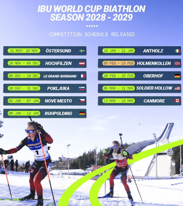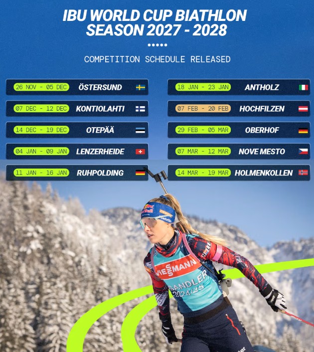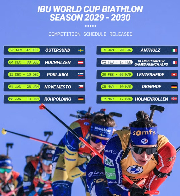 IBU утвердил распределение мест проведения Кубка мира IBU по биатлону на четыре сезона с 2026/2027 по 2029/2030 гг., при этом уже подтверждено проведение чемпионатов мира в Отепя (EST) в 2027 году, Хохфильцене (AUT) в 2028 году и Осло (NOR) в 2029 году.
