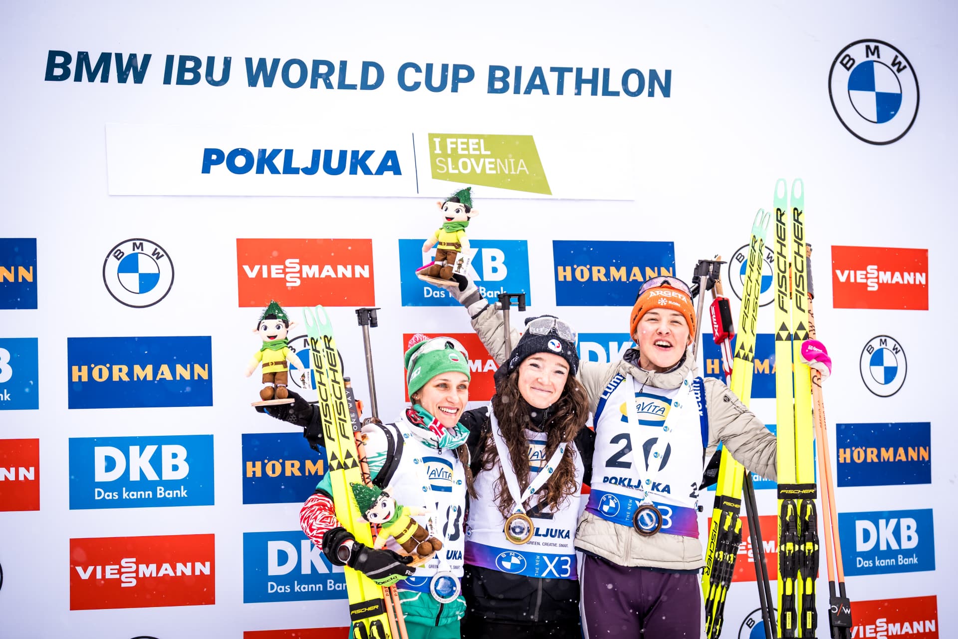 Француженка Лу Жанмонно и её соотечественник Эрик Перро выиграли гонки с общего старта на этапе Кубка мира по биатлону в словенской Поклюке.