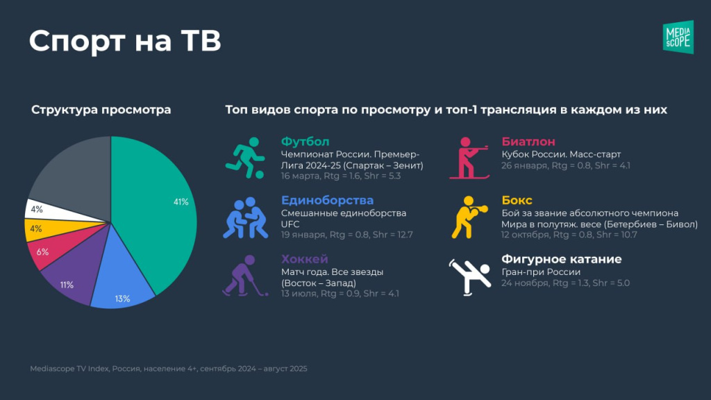 Любопытные свежие данные компании Mediascope лидера российского рынка медиаисследований о том, за какими видами спорта россияне следят по ТВ. Исследование охватывало вещание общедоступных телеканалов за годичный период, начиная с сентября 2024 года. Ничего удивительного в том, что самым популярным видом спорта у российских телезрителей является футбол, на который приходится 41% всего времени просмотра спортивного контента.