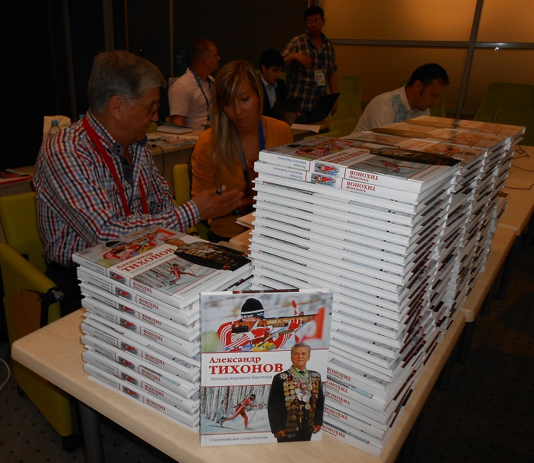 Александр Иванович подписывает книги волонтерам чемпионата мира по летнему биатлону в Тюмени
