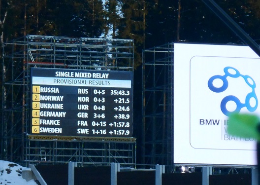 Российские биатлонисты Яна Романова и Алексей Волков выиграли первую в истории Кубка мира по биатлону официальную одиночную смешанную эстафету. Всё решил последний огневой рубеж, где шедший лидером представитель сборной Германии Эрик Лессер неожиданно заработал сразу три штрафных круга. В итоге немцы вообще остались без медали, пропустив вперёд помимо россиян команды Норвегии и Украины.