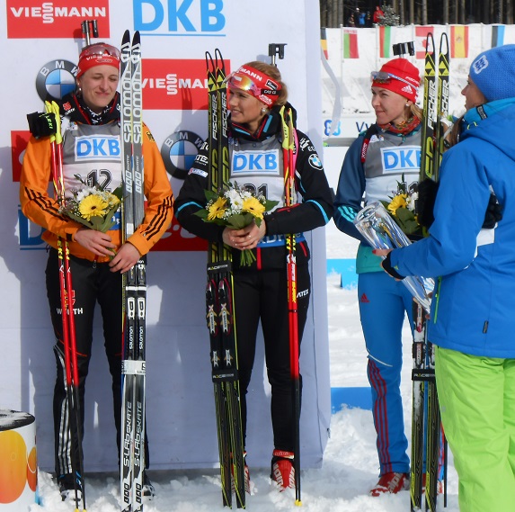 Дарья Домрачева, оставшаяся во вчерашнем спринте в шаге от пьедестала почета, сегодня стала лучшей, выиграв гонку преследования несмотря на четыре промаха. Второе место у лидера Кубка мира Кайсы Мякяряйнен из Финляндии, которая является также лидером в зачете гонок преследования. Кайса полностью повторила стрельбу Дарьи, допустив такое же количество промахов на каждом рубеже, как и белорусская биатлонистка: 2-0-1-1. Но стартовала она на три позиции дальше, поэтому даже лучший ход не позволил финке претендовать на победу. Третьей финишировала победительница спринта Лаура Дальмайер из сборной Германии, это третье призовое место в карьере многообещающей немецкой биатлонистки.