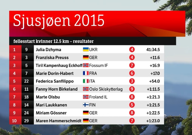 Украинка Юлия Джима выиграла гонку с общего старта на традиционных соревнованиях открытия сезона в норвежском Шушене. Второе место у немецкой биатлонистки Франциски Пройс, норвежка Тирил Экхофф третья.