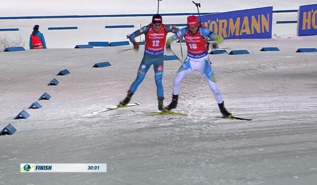 Вторым финишировал представитель сборной Словении Яков Фак, стартовавший десятым и допустивший два промаха, третье место завоевал француз Кантен Фийон Майе, стартовавший с 12 места и тоже с двумя штрафными кругами.