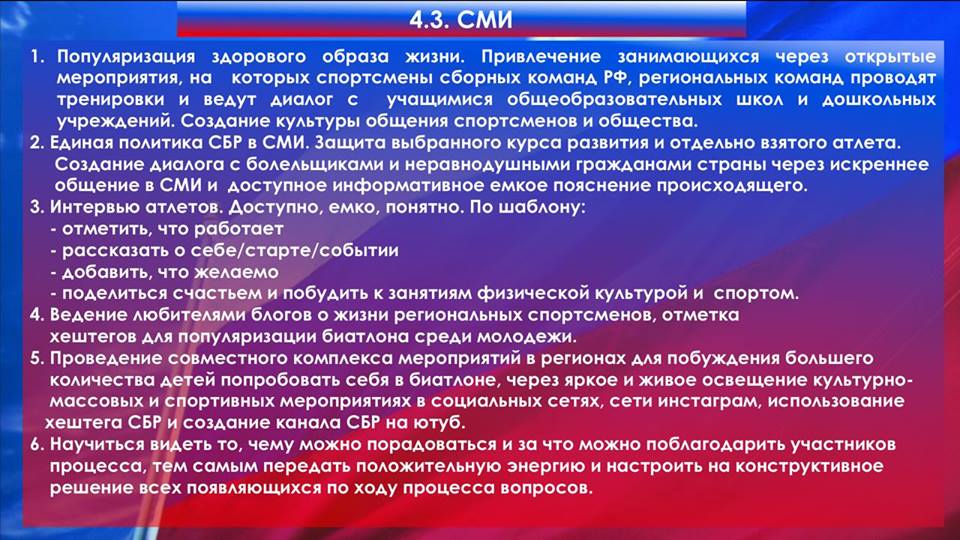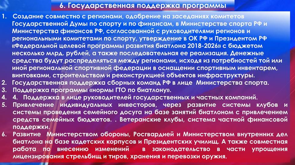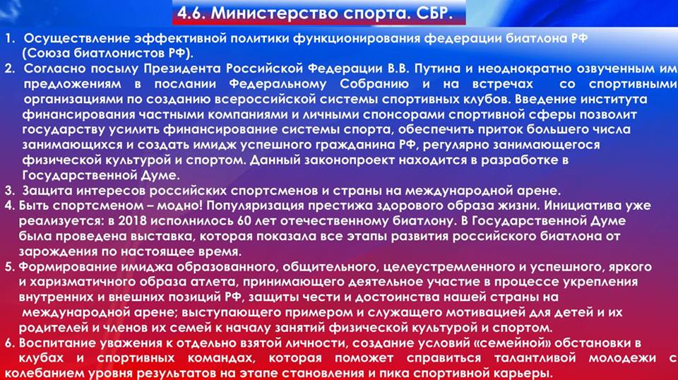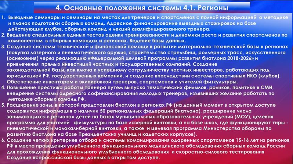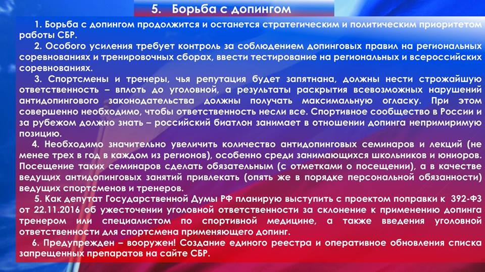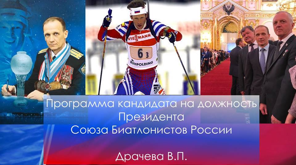 В своей программе Владимир Драчев определил следующие основные пункты: приоритетные направления деятельности СБР, система взаимодействия участников процесса, основные положения систем — регионов РФ, сборных команд России по биатлону, СМИ, партнеров, спортивных клубов, ветеранского движения и взаимодействие государства, минспорта и СБР, борьба с допингом, а также государственная поддержка программы.