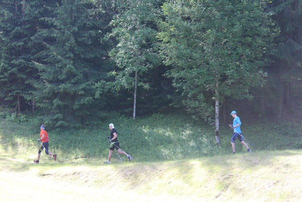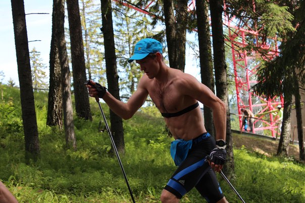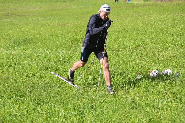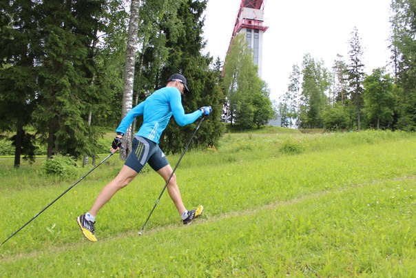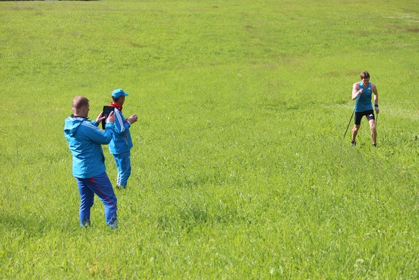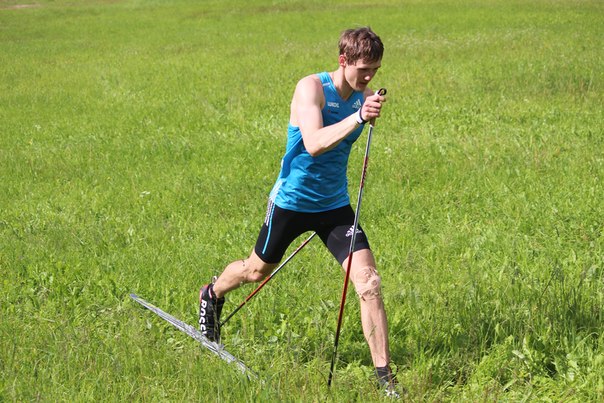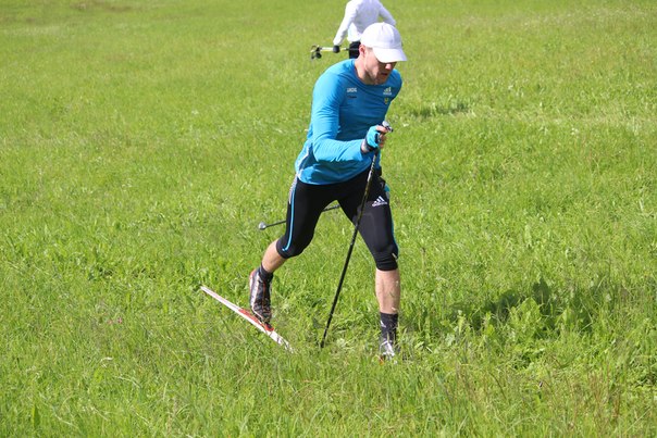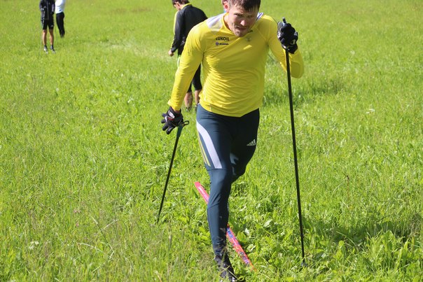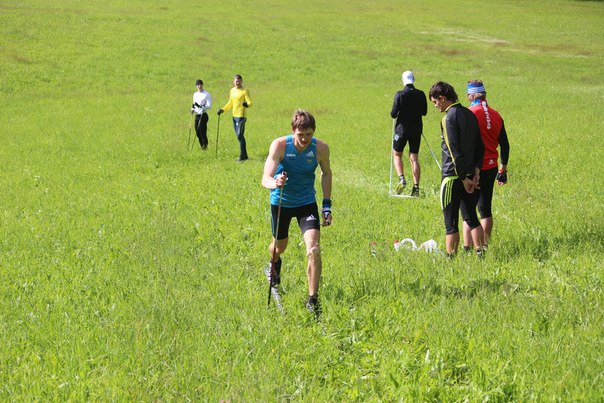 Ноу-хау Юрия Михайловича Каминского - летние тренировки на лыжах по траве. На подъеме работает Никита Крюков