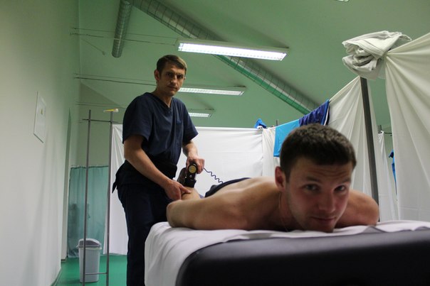 Мануальный терапевт Сергей Чечиль проводит восстанавливающие процедуры с Антоном Гафаровым