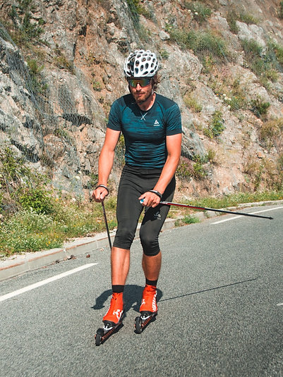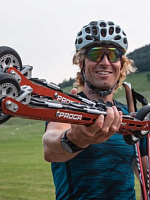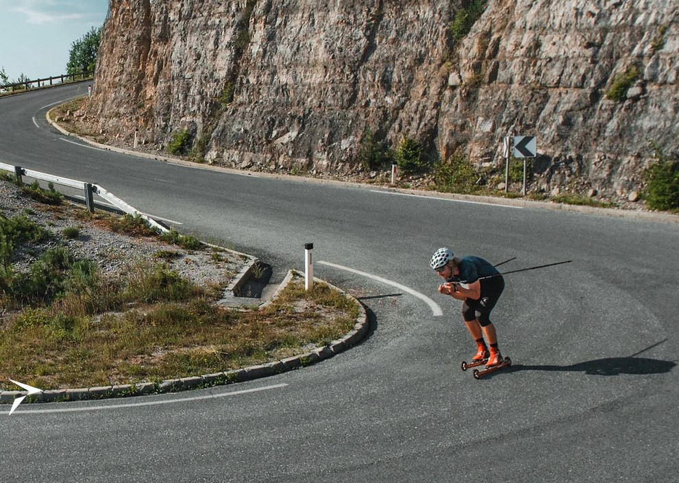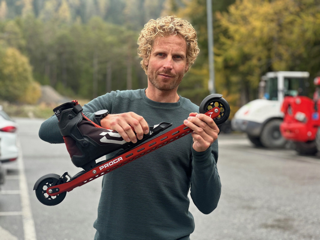 Словенский биатлонист Клемен Бауэр представляет новые роликовые лыжи, которые позволяют эффективно тормозить и контролировать скорость. Спортсмен стал одним из разработчиков и испытателей интегрированной тормозной системы. Тесты показали надежное сцепление и хорошую управляемость скорости даже во влажных условиях на мокром асфальте.