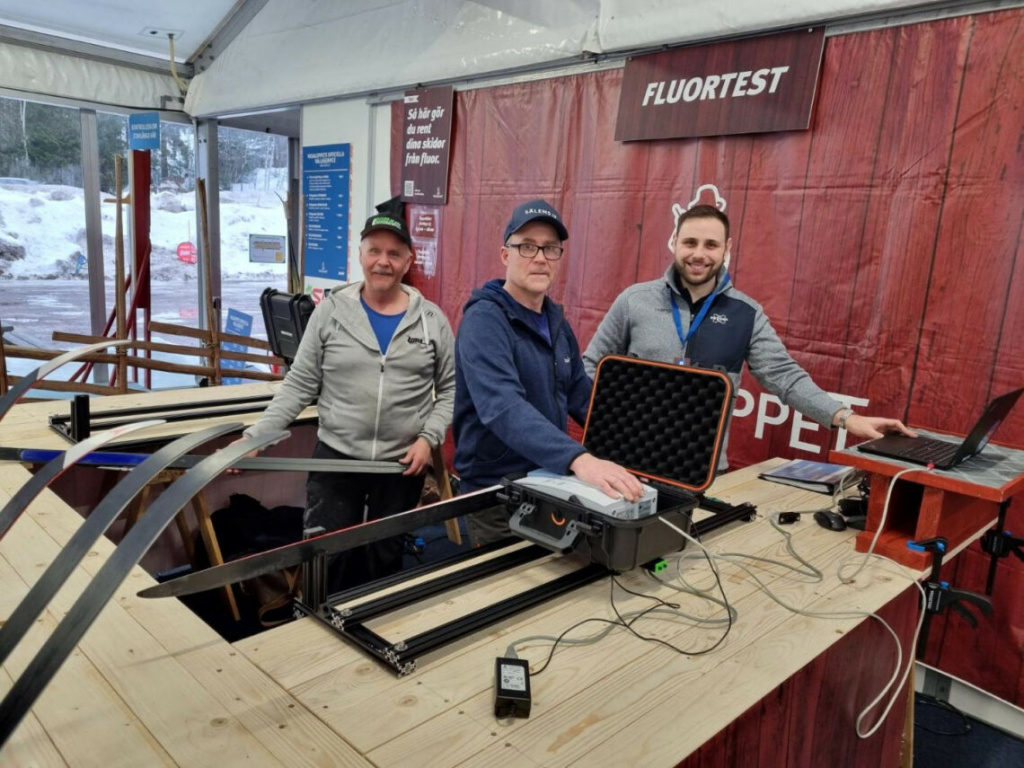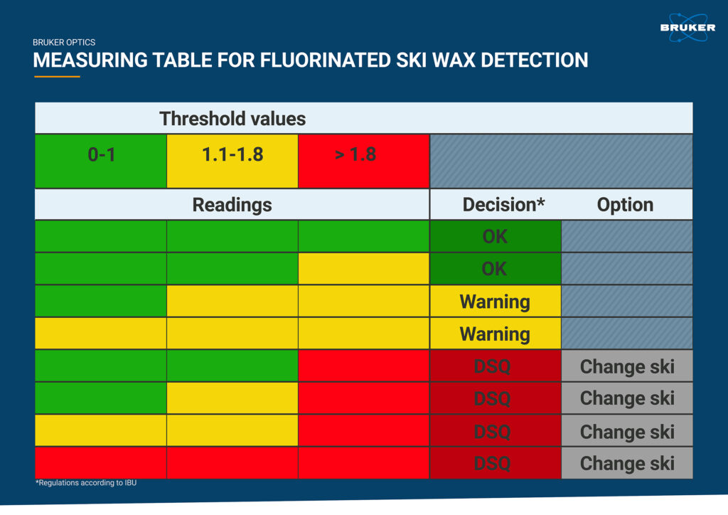Тестирование проводится в специальной зоне обычно около финиша. Приборы-измерители Bruker Alpha II проводят спектрометрию FTIR для обнаружения фтора. Сначала тестируется область в передней части лыжи, а также два места за ботинком. Каждое показание диффузионного сигнала сравнивается с многомерной моделью QUANT, включающей инфракрасные спектры предыдущих образцов мазей без фтора. Эта модель постоянно развивается, чтобы охватить ИК-спектры новых одобренных продуктов.