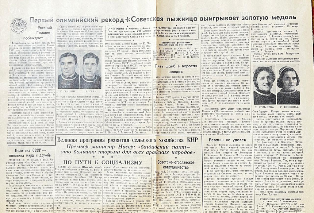 Первой золотой медалью советских спортсменов на зимних Олимпийских играх стала победа Любови Козыревой. Этот результат засчитывался также, как победа чемпионата мира. Интересно, что все советские лыжники гонялись на отечественных лыжах, за исключением Владимира Кузина, который использовал пару финских лыж Järvinen, подаренных ему знаменитым фином Вейкко Хакулиненом в знак дружбы и уважения.