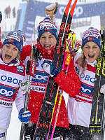 Сборная Норвегии в составе Тириль Уднес Венг, Ингвильд Флюгстад Эстберг, Терезе Йохауг и Хейди Венг выиграли женскую эстафету 4х5 км, которая прошла сегодня, 1 марта, на XI этапе Кубка мира 2019/20 по лыжным гонкам в финском Лахти. Второе место у хозяек Йоханны Матинтало, Кертту Нисканен, Лауры Мононен и Кристы Пармакоски. В драматичной борьбе за бронзу сборная Швеции, за которую выступали Шарлотте Калла, Фрида Карлссон, Ребекка Эрн и Майя Дальквист, опередила россиянок Наталью Непряеву, Алису Жамбалову, Екатерину Смирнову и Яну Кирпиченко.