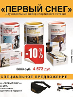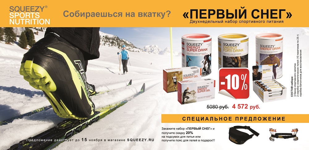 До 15 ноября в магазине SQUEEZY.RU действует специальное предложение. Мы предлагаем двухнедельный набор спортивного питания со скидкой 10% от розничных цен. Набор специально рассчитан для тренировок на снегу. Помимо этого действует специальное предложение: при покупке двухнедельного набора мы даем право на скидку 20% на подсумок для питья либо дарим в подарок пояс для энергетических гелей.