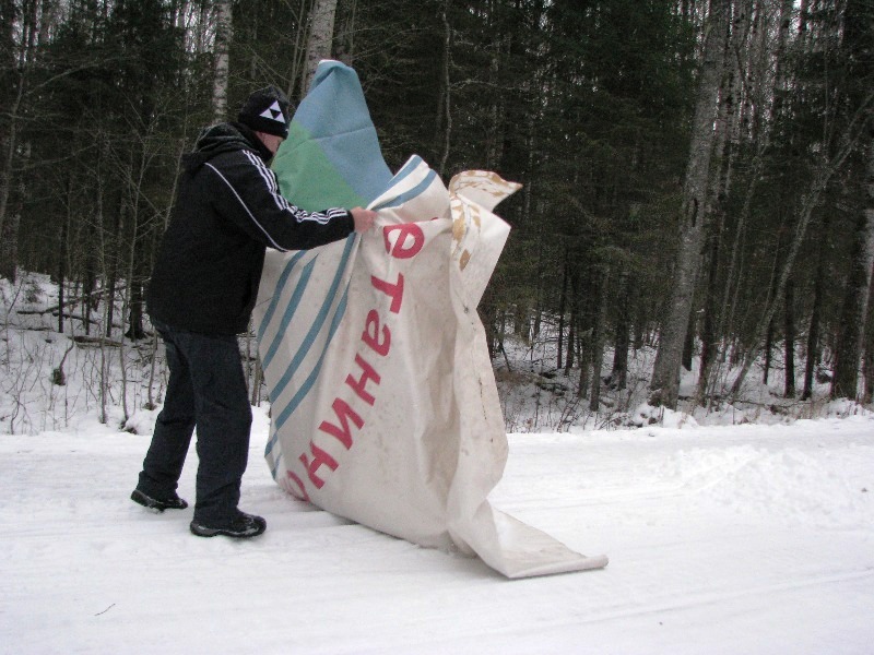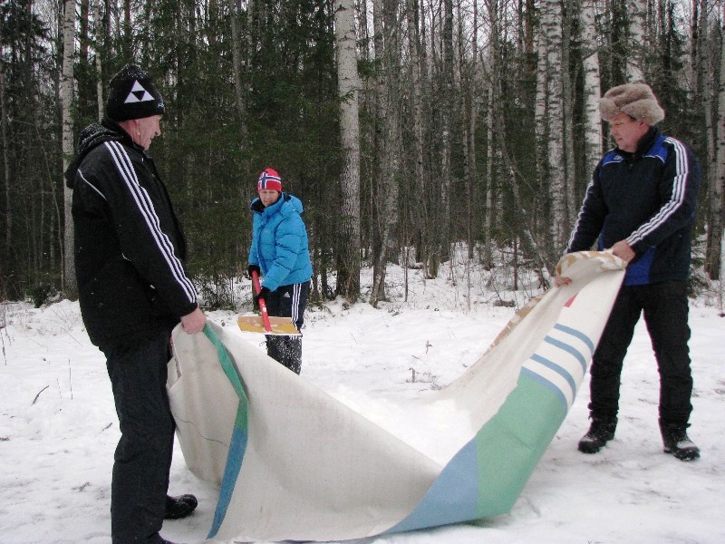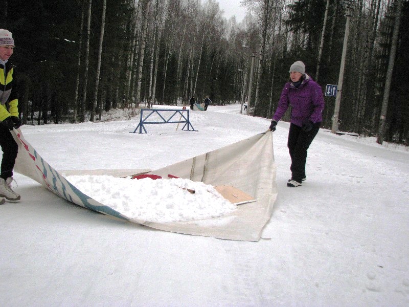 На двух снегоходах к дальним петлям привезли несколько десятков лопат, куски старых баннеров и оставили тренеров один на один с остатками снега и замерзшей обледенелой дорогой.