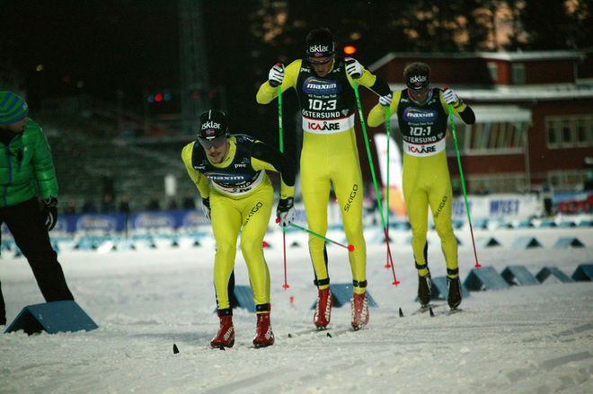 IFK MORA SK fick åka utan Emil Jönsson och blev sist. Joakim Engström (i mitten) slet med tempot till Daniel Svensson och David Frisk. Foto: MARCELA HAVLOVA