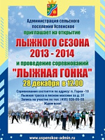 на Кубок главы сельского поселения Успенское, которые должны были состояться в ближайшую субботу, 28 декабря, в подмосковных Горках-10, перенесены на 19 января из-за отсутствия достаточного снежного покрова на трассе. Оргкомитет соревнований приносит лыжникам свои извинения.