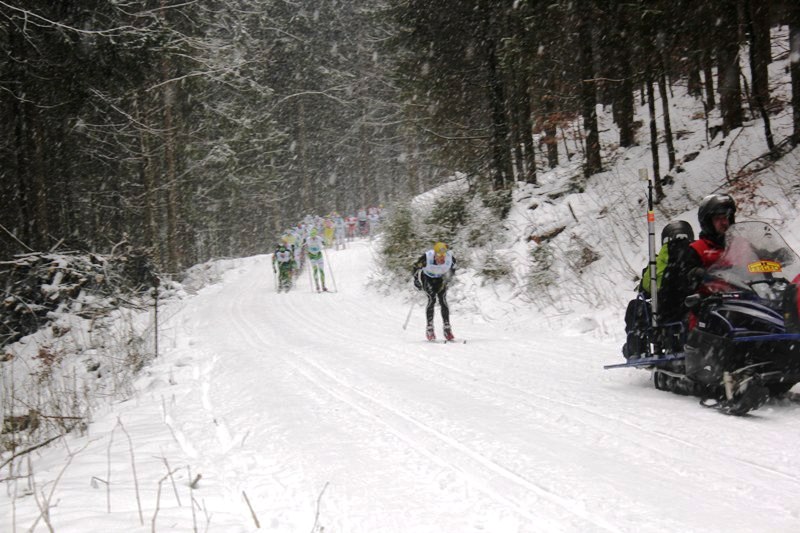Финиш победителя Йохана Чёльстада из команды Юнайтед Бэйкирис. Слева в кадре знаменитый двукратный победитель Васалоппет швед Даниэль Тюнелль. Именно он за три километра до финиша прыгнул на лыжи россиянину Николаю Болотову из Витарго и сломал её. Тем не менее, даже на сломанной лыже Коля умудрился занять высокое 13-е место.