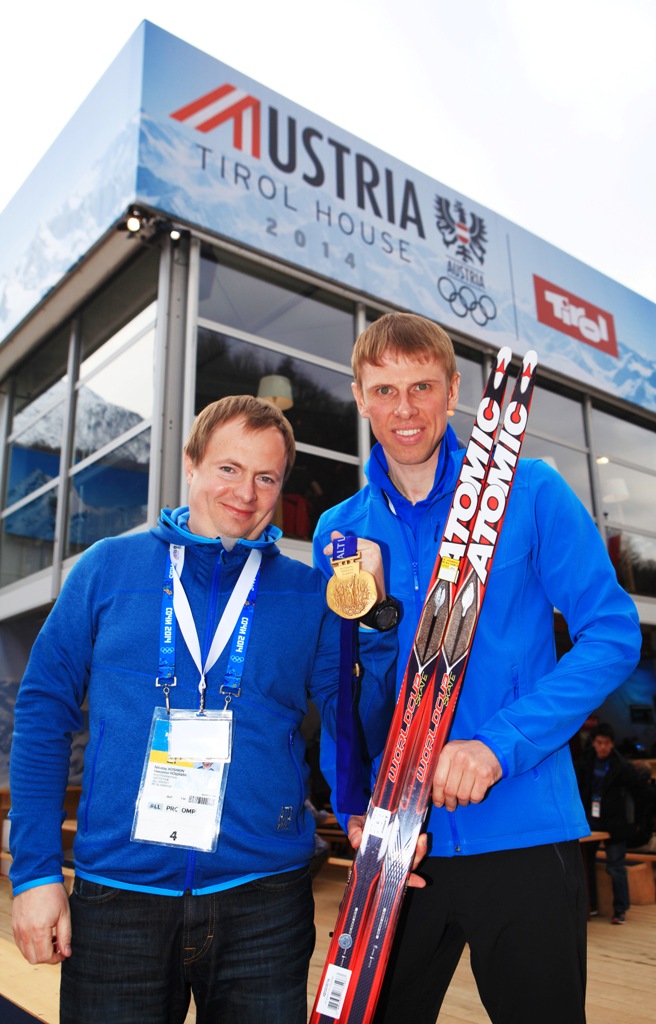 Олимпийский чемпион Михаил Иванов с золотой медалью Солт-Лейк-Сити и Николай Кошкин, директор по работе с государственными и спортивными организациями Amer Sports