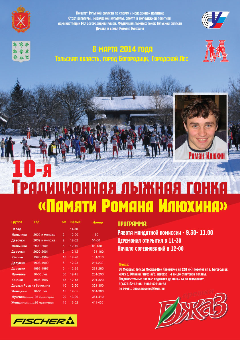 В Международный женский день, 8 марта, в городе Богородицк Тульской области пройдут десятые юбилейные традиционные соревнования памяти Романа Илюхина. На соревнования памяти, проводящиеся в родном городе спортсмена, традиционно собираются сильнейшие гонщики Тульской и соседних областей, а также спортсмены из Москвы. В этом году соревнования будут иметь статус открытого Первенства Тульской области по лыжным гонкам.