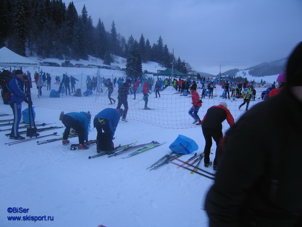 На следующий день нам предстоял конёк. Из-за малоснежья дистанцию с 76 км сократили до 71 (официально было 70 или даже 69 км). Старт был ранним, мы выехали из гостинцы, когда было ещё темно. По сравнению с субботним марафоном, старт был смещён практически на 20 км в юго-западном направлении. Но опять же из-за специфики горных дорог и организации движения нам достаточно долго пришлось покататься в поисках парковки. Автомобиль мы оставили примерно в 500-700 м от старта на дороге, взяли свои вещи и отправились в стартовый загон. Одежду для переодевания и разминку мы сложили в предоставленные пакеты. После старта пакеты с вещами участников организаторы перевозили на финиш.